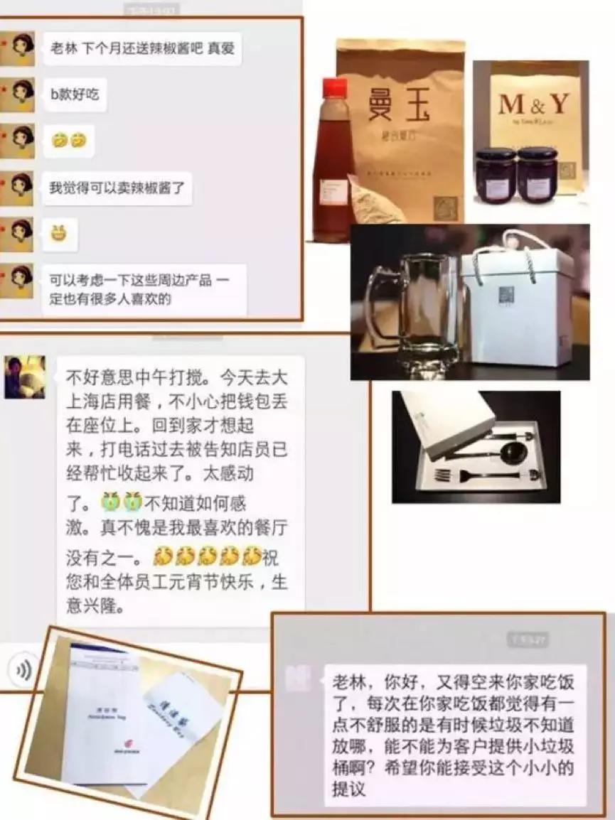 他把自己的微信二維碼貼到每張餐桌上。當餐廳還沒開通微信公眾號時,他個人號就積累了4萬名粉絲。為此還專門成立了曼玉客服組,三個人管理十臺PAD,收集反饋,第一時間回復。